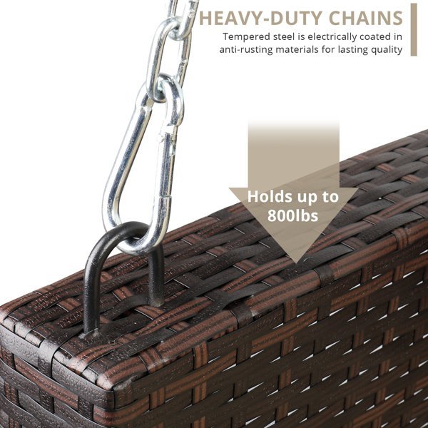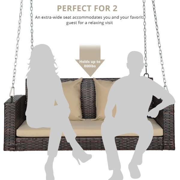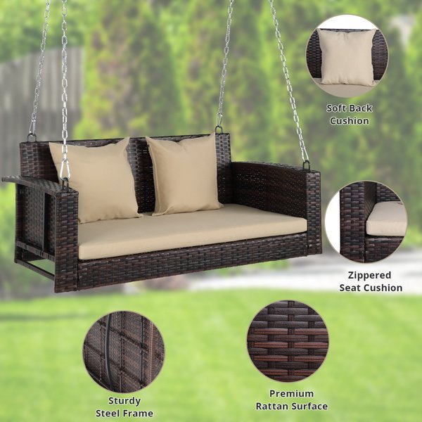 Here is our 49in Brown Gradient Rattan  Beige Cushion Rattan Swing Chair. This beautifully swing chair will complement your outdoor furniture setting.   Enjoy a nice sunny day or cool summer night; swinging on this elegant bench swing.   place a cushion on it for added comfort and enjoy this new patio swing during the day or night.   What are you hesitating about?   Buy it!