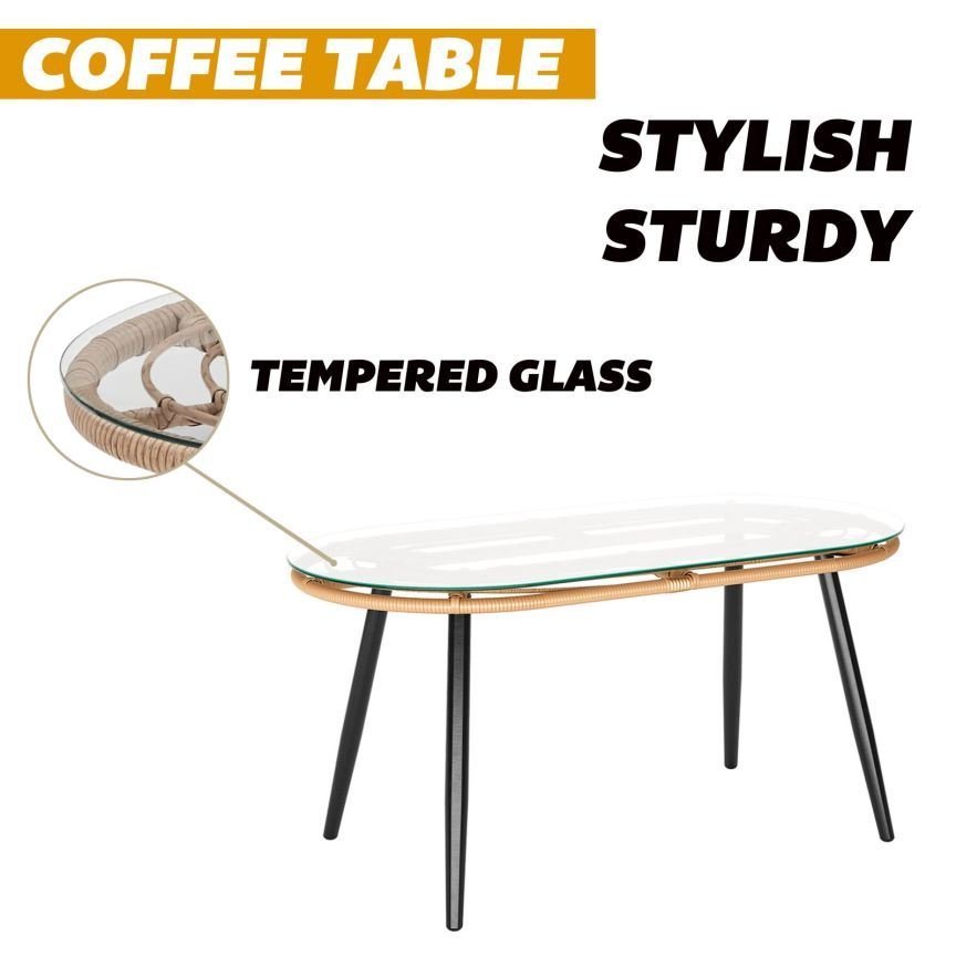 Wrapped around a steel frame with an earthy open weave Round and Flat Rattan in a natural tan color with grey cushions and a coffee table that features clear tempered glass.