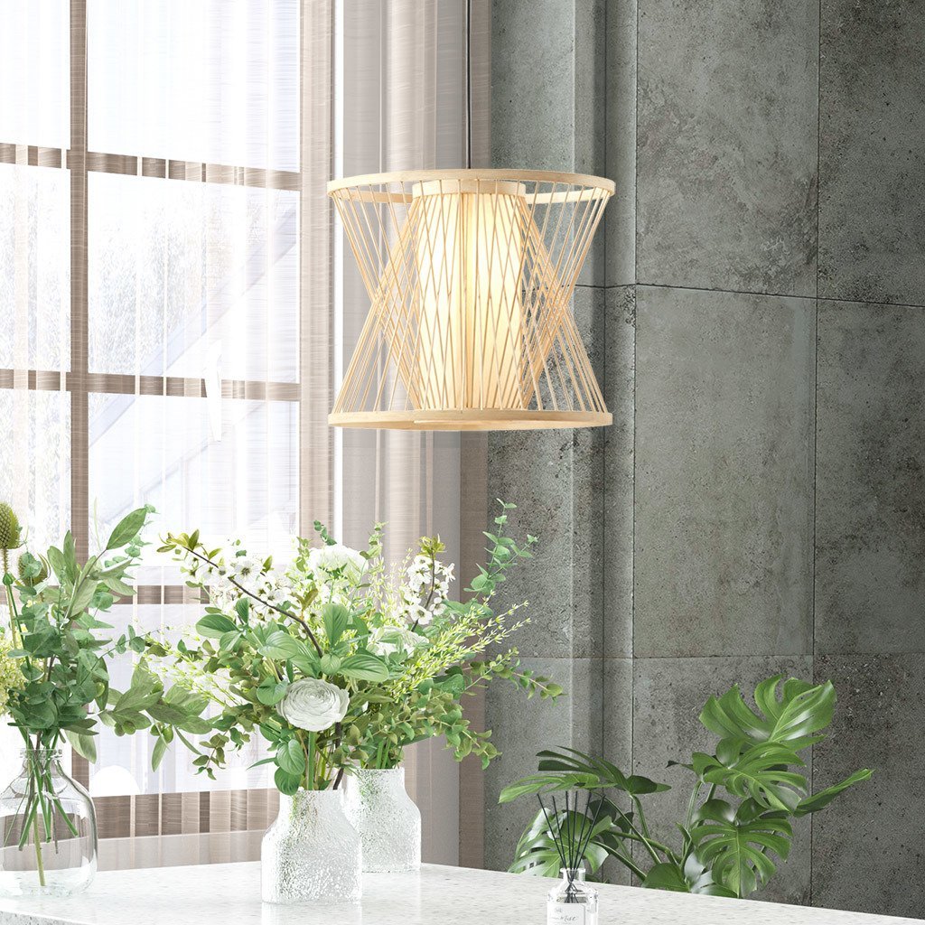 Make a statement in your home with INK+IVY's Aria Geometric Bamboo Pendant. Featuring a uniquely designed natural bamboo rattan shade with a cylindrical shade in the center, this hanging pendant brings a refreshing update to your space. The hanging cord and ceiling mount have a fixed height of 48.75' and provides a contrasting touch to the elevated artistic design. Hardwire for indoor use only, this modern pendant is compatible with a sloped ceiling. Professional installation is also recommended and mounting hardware is included. Use one Type A light bulb (not included).
