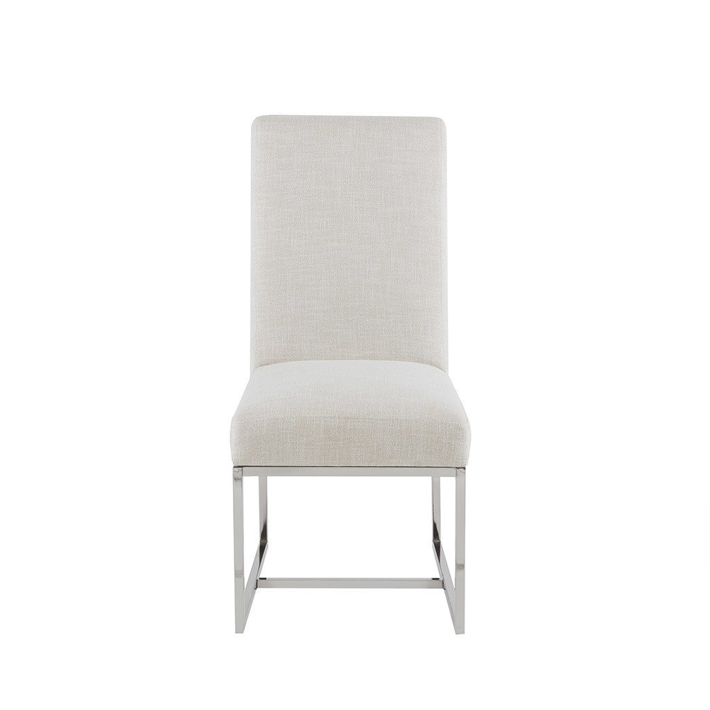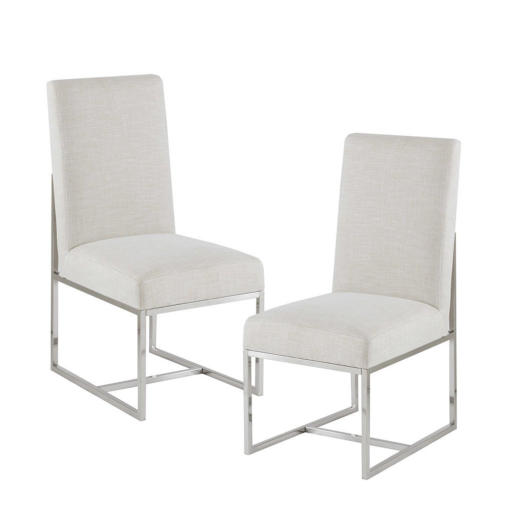 Give your dining room a simple and modern look with the Madison Park Junn Dining Chair 2 Piece Set. Upholstered in a soft natural-hued fabric, these dining chairs feature a brushed nickel plated finish on the metal legs to create a rich contemporary allure. Available in a two piece set, these modern dining chairs introduce a simple elegance to your dining décor. Assembly is required and tools are included for your convenience.
