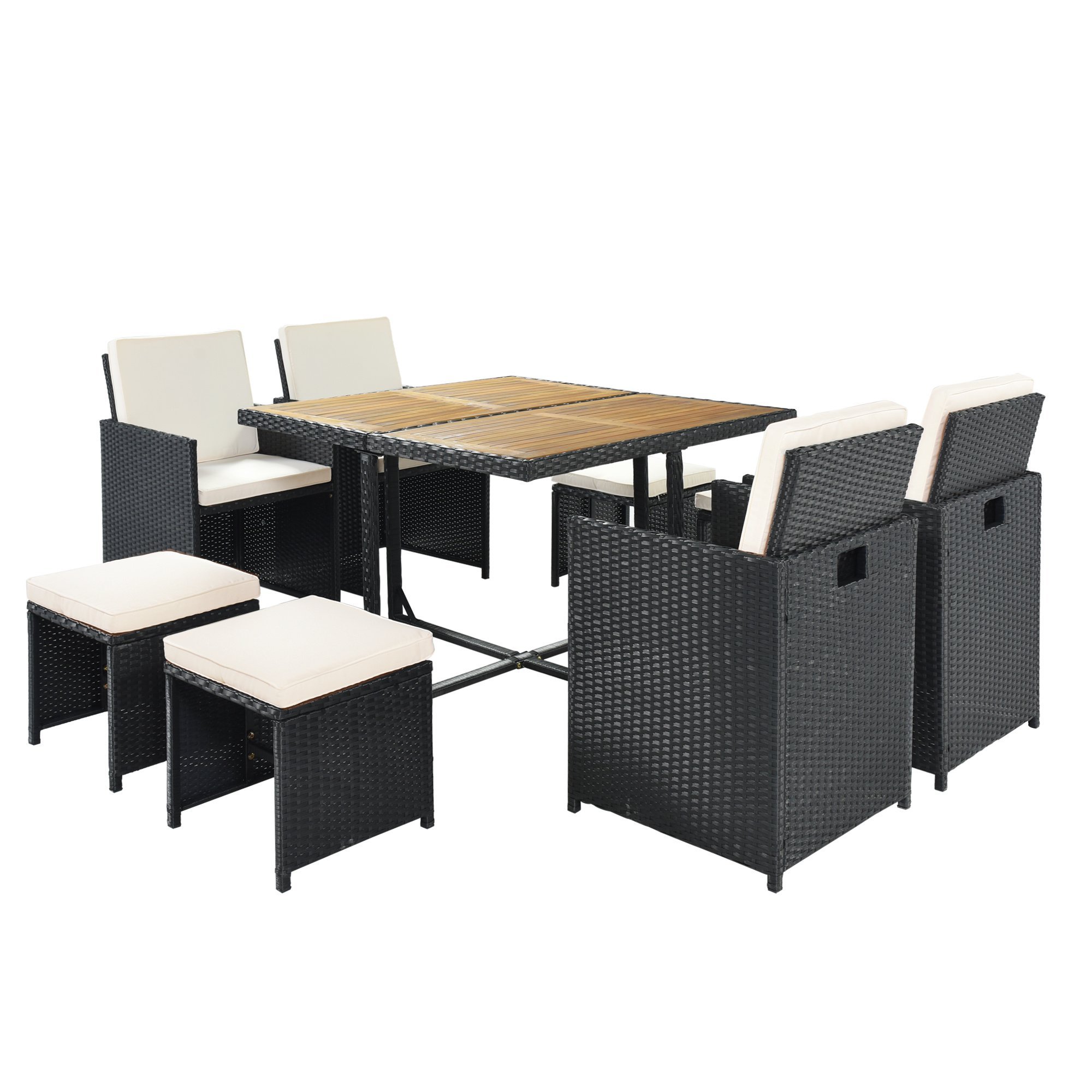 Patio All-Weather PE Wicker Dining Table Set with Wood Tabletop for 8; Black Rattan+Beige Cushion (9-Piece)