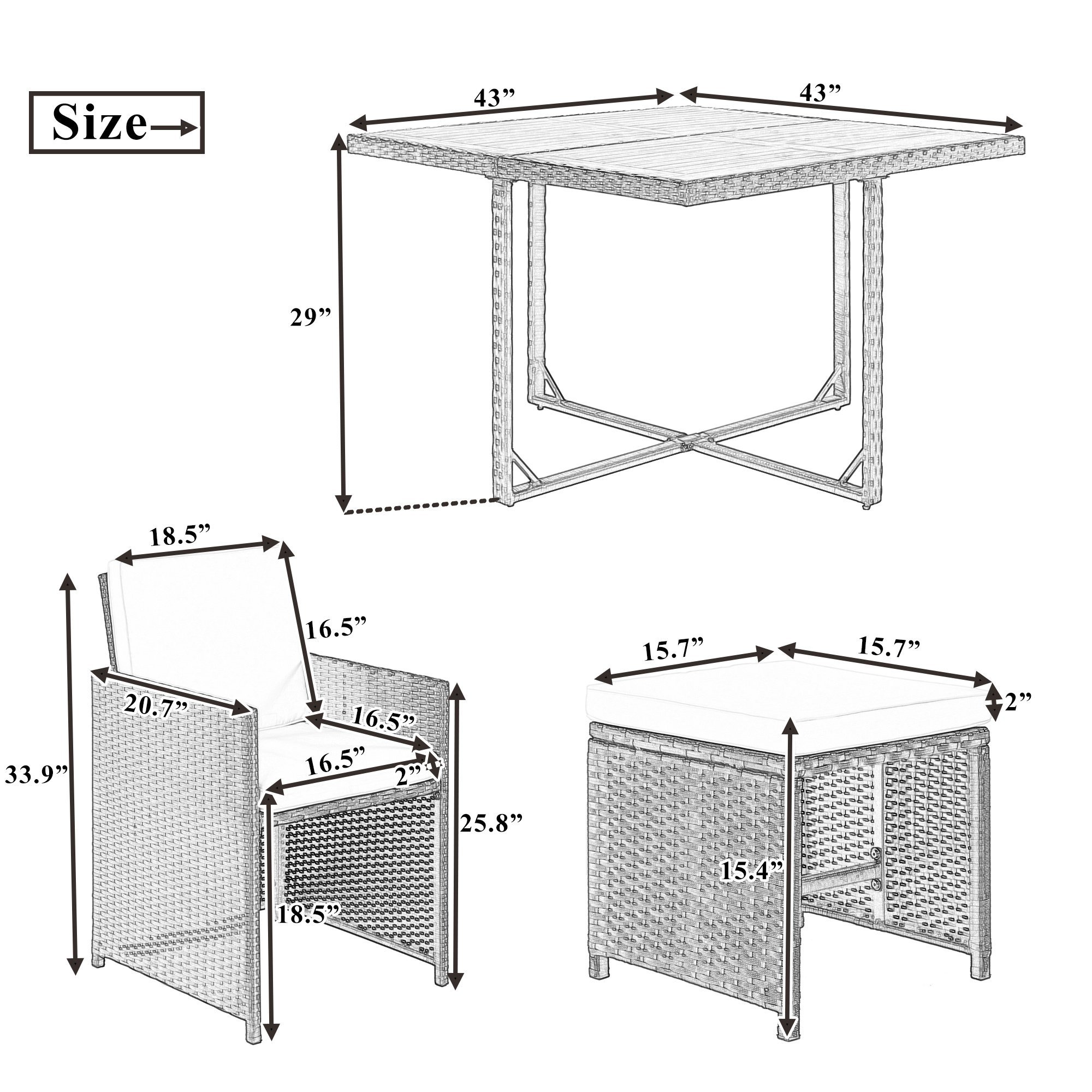 Overall Product Dimension | Table: 43x43x29inch(LXWXH); Chair: 20.7x18.5x33.9inch(LXWXH); Seat to ground: 18.5inch(with cushion); Stool: 15.7x15.7x15.4inch(LXWXH; with cushion); Back Pillow: 18.5x16.5x2inch(LXWXT); Chair Cushion: 16.5x16.5x2inch(LxWXT); Stool Cushion:15.7x15.7x2inch(LXWXT) |