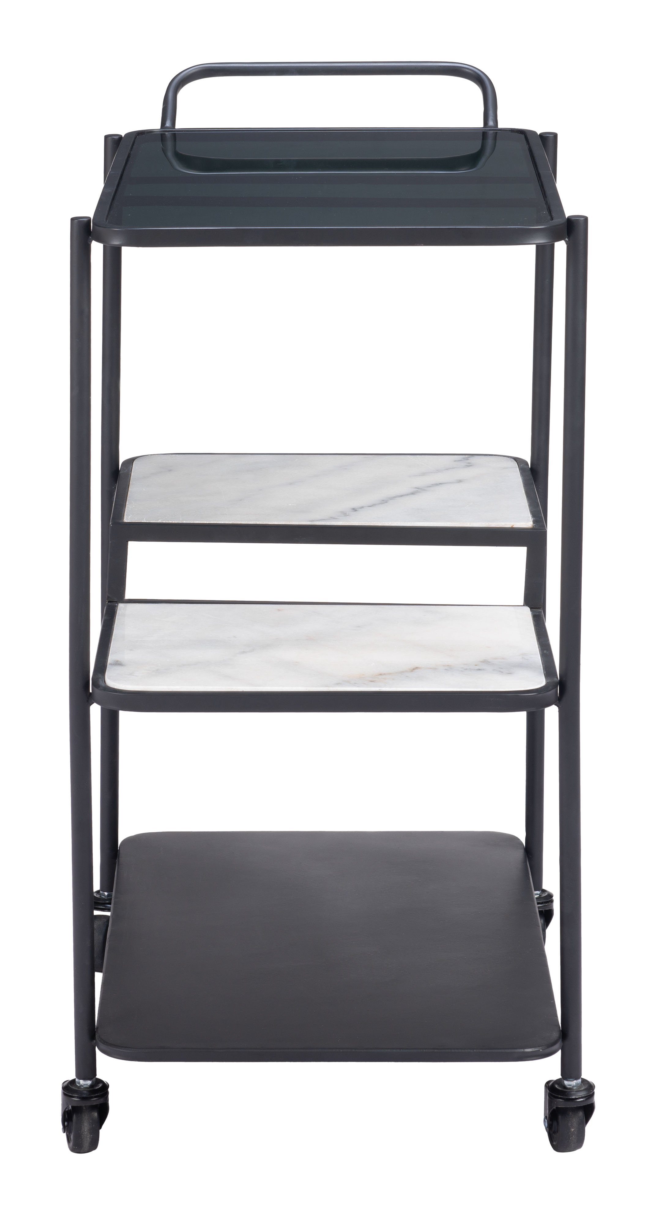 Introducing the Constanza Bar Cart: A harmonious blend of form and function. This sleek black bar cart features a robust steel frame, tempered glass shelves, and luxurious marble accents. Its minimalist design effortlessly complements any interior, from modern to classic. Effortless mobility is guaranteed with smooth-rolling casters, and a locking mechanism adds stability. Beyond its role as a stylish bar cart, it's a versatile piece that adapts to your needs, whether as a coffee station, storage solution, or chic display unit. Elevate your entertaining and decor with the Constanza Bar Cart today.