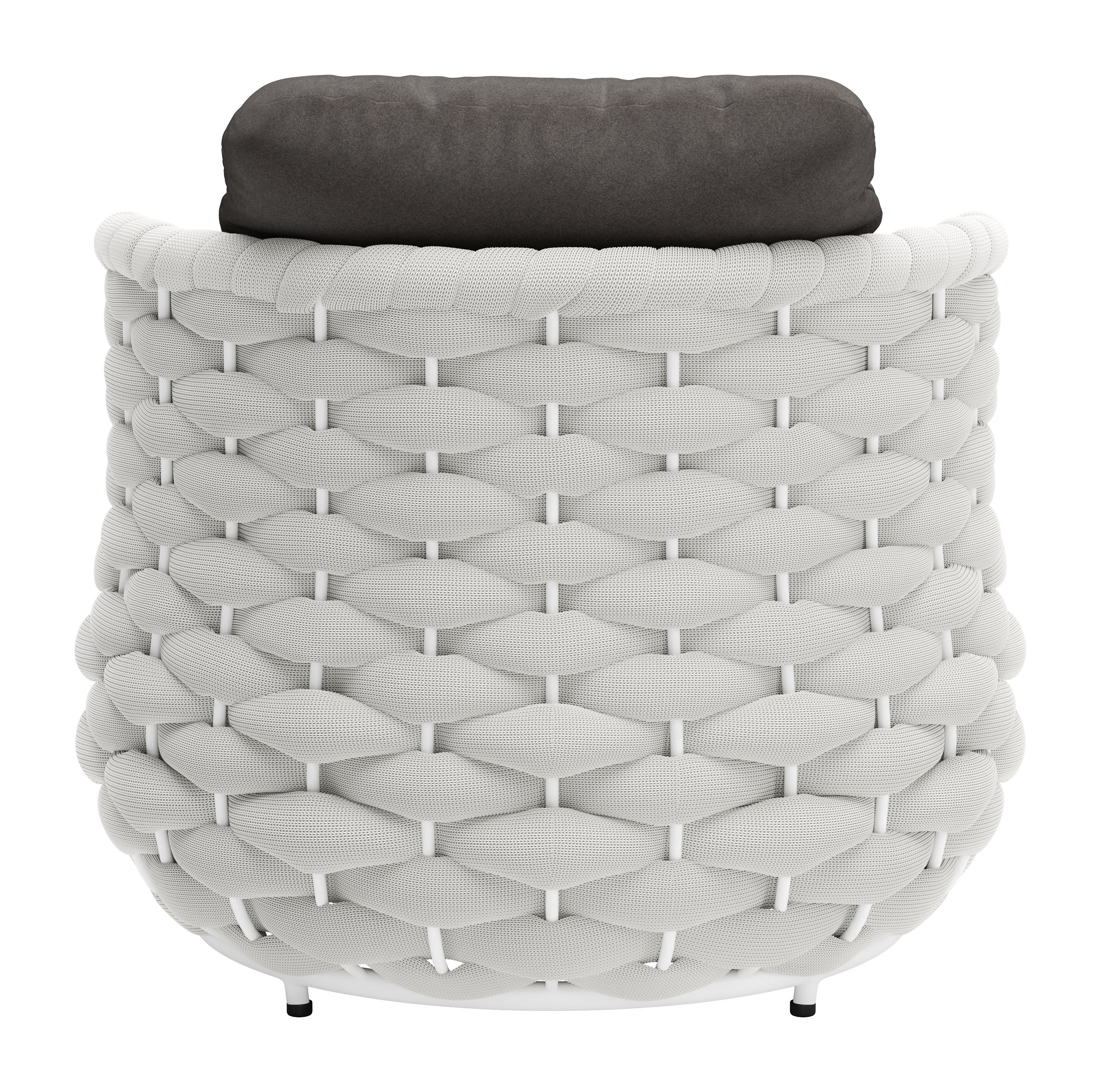 The Coral Reef Armchair, featuring a durable aluminum frame and draped in olefin fabric, showcases a stylish, contemporary form adaptable to diverse environments like a rooftop deck in a condo, a serene Airbnb retreat, or an elegant boutique hotel.