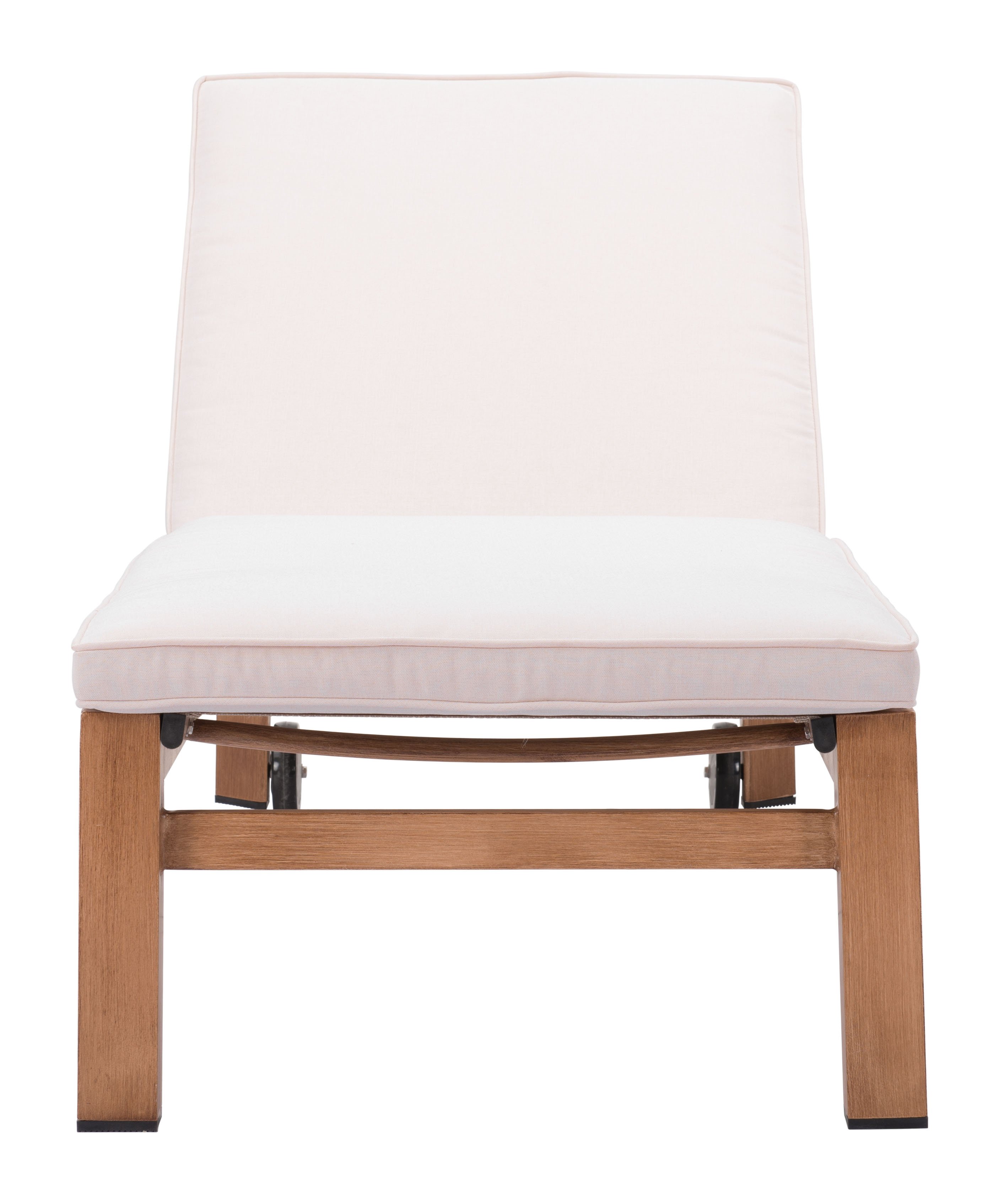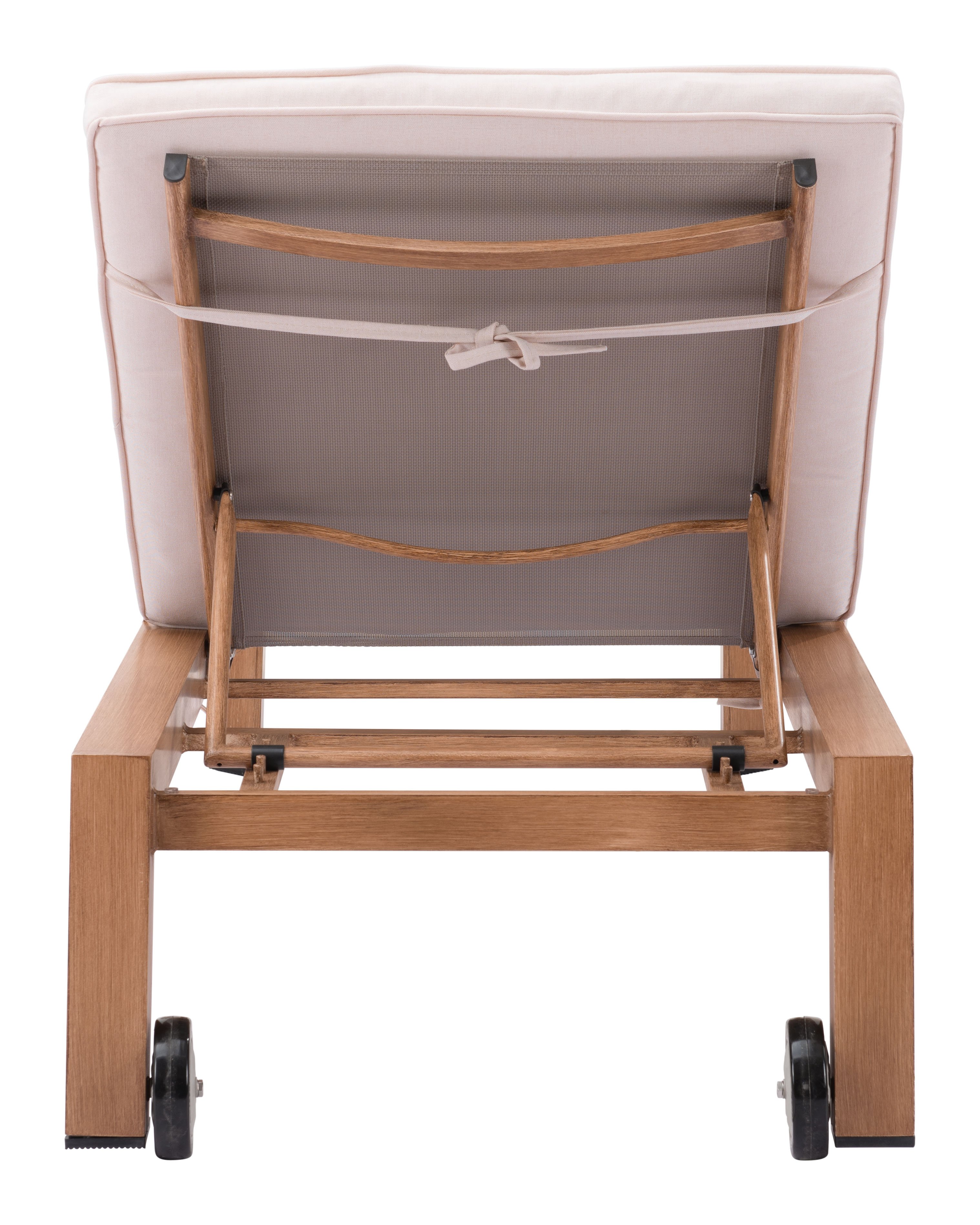 The Cozumel Lounge has an aluminum frame with a powder coat finish with an adjustable back and wheels; the cushion is wrapped in water-resistant olefin fabric.  This Lounge has a painted wood simulated finish to bring durability to that boho Chic outdoor resort look.