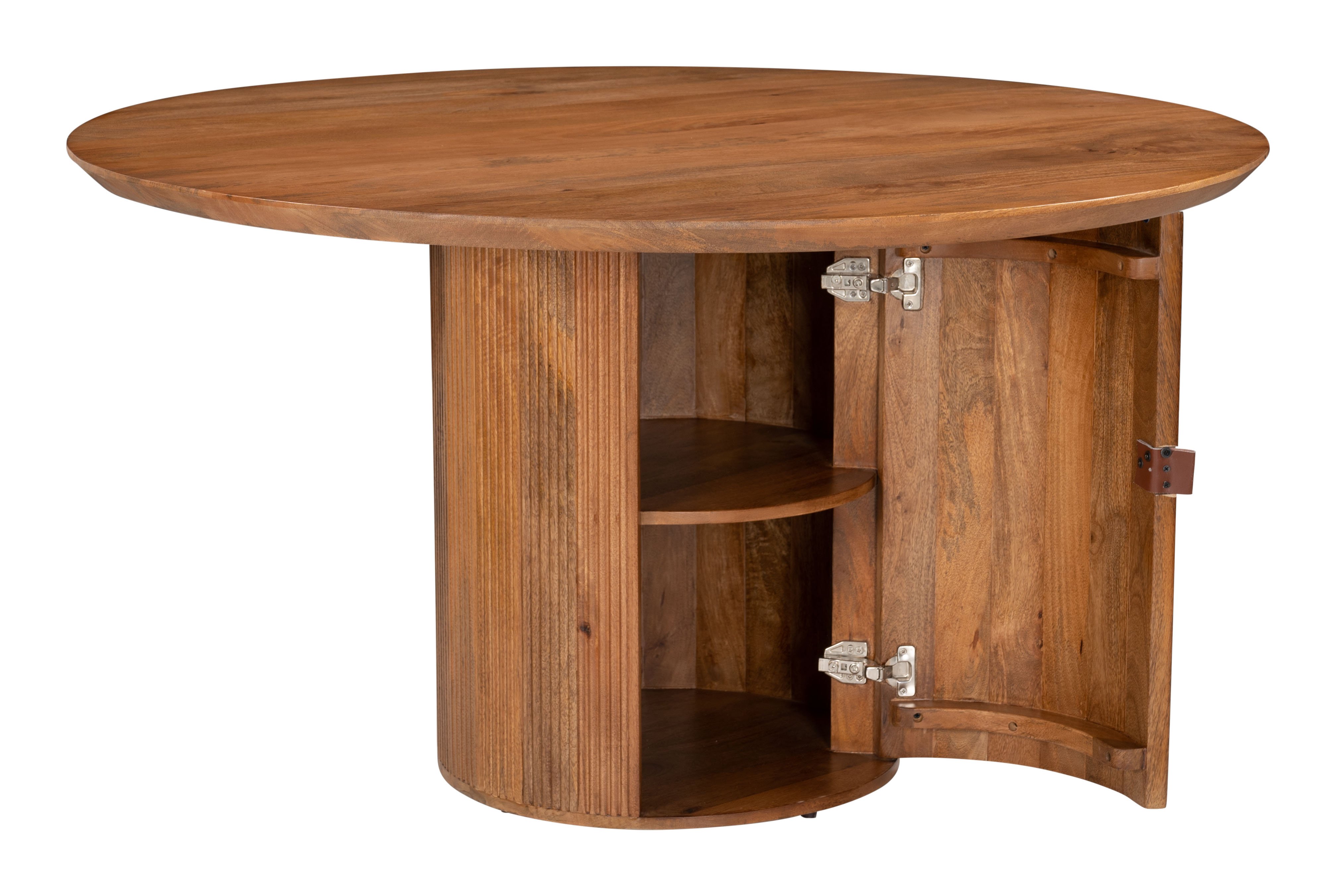 The Izola Dining Table is a beautiful and functional piece of furniture that would make a great addition to any modern dining room. It is made from brown-stained mango wood, which provides a warm and inviting feeling to the space. The table features a unique storage compartment inside the base, which is perfect for storing dinnerware or other items. This feature makes it an excellent choice for smaller spaces, such as apartments or condos, where storage can be at a premium.