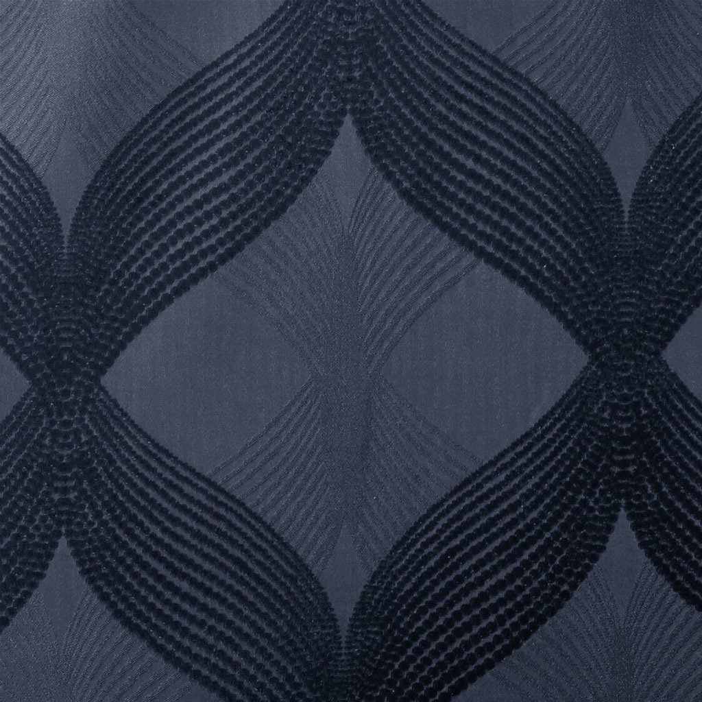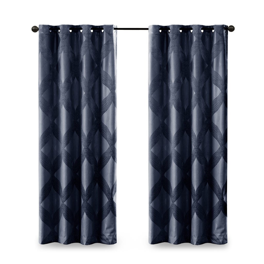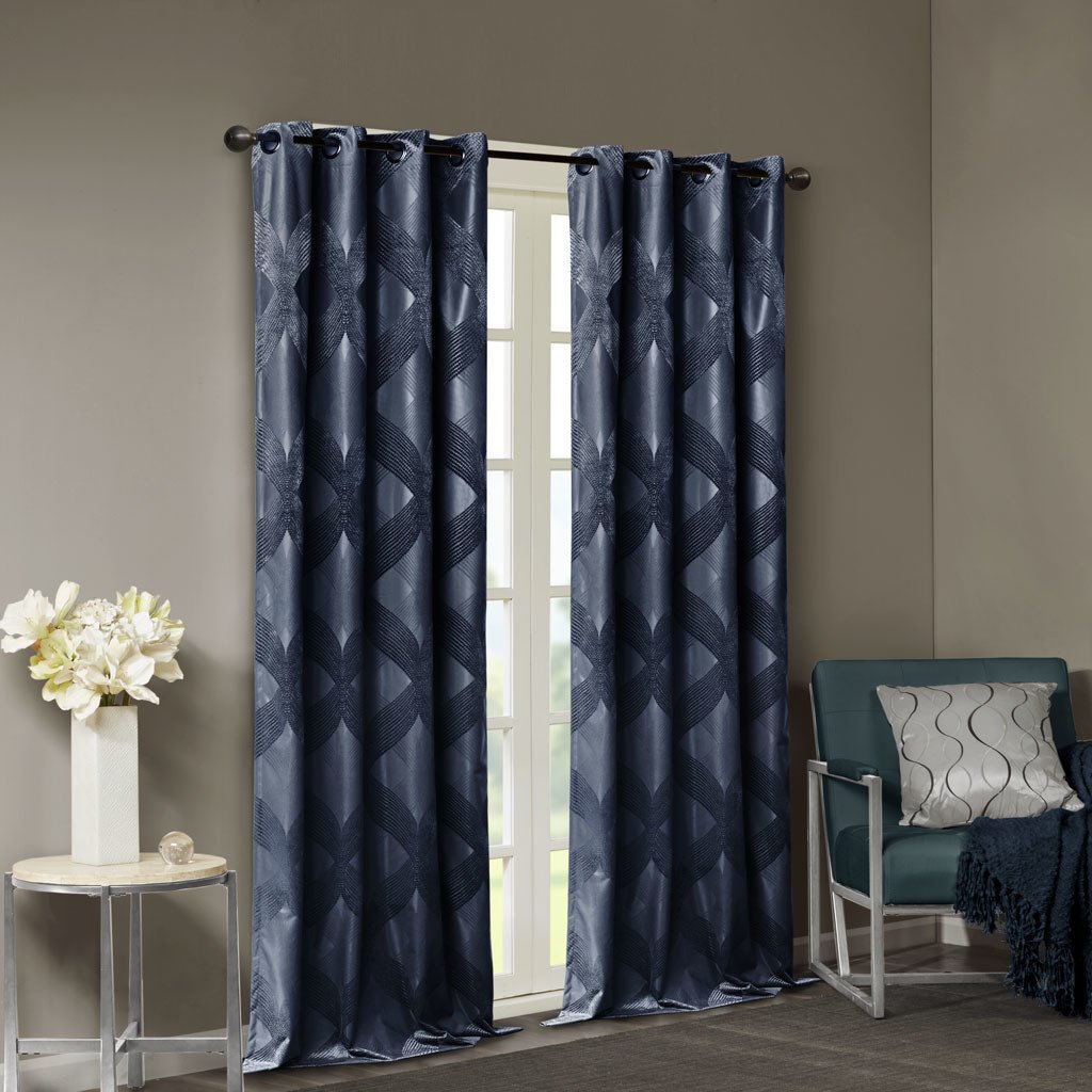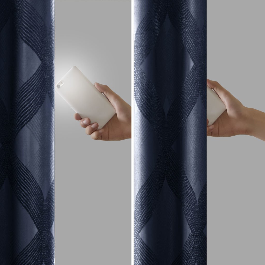 Combining luxe style with functionality, our SunSmart Bentley Ogee Knitted Jacquard Total Blackout Panel is the perfect update to dress any window. An ogee knitted jacquard design is featured in a rich navy hue, creating a luxurious sheen and texture. The heavy fabric uses a foamback and bonding finish enhancing the panel to block out all sunlight, provide a maximum protective barrier against noise intrusion, and offer a maximum level of privacy and energy savings. A silver grommet top finish makes it easy to hang, open, and close panels throughout the day; fits up to a 1.25' diameter rod. With 100% total blackout properties, this window panel is the perfect addition for bedrooms, media rooms, or any private spaces, giving your home a lavish and contemporary appeal. Lighting level: Pitch Black Ambiance.