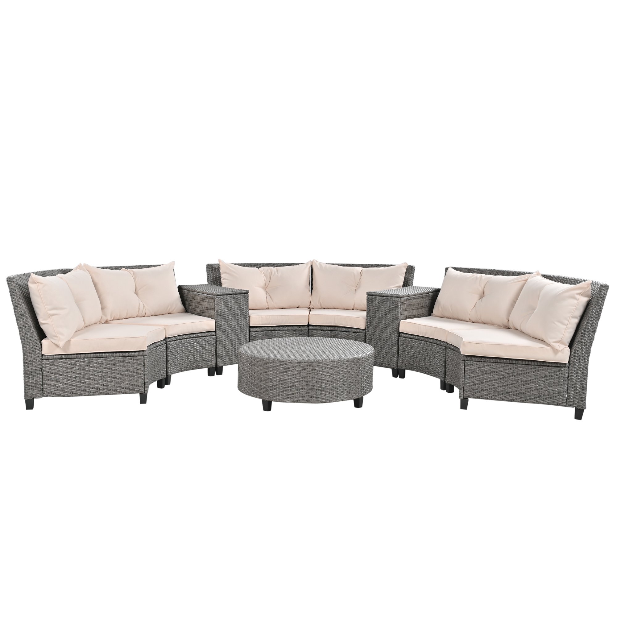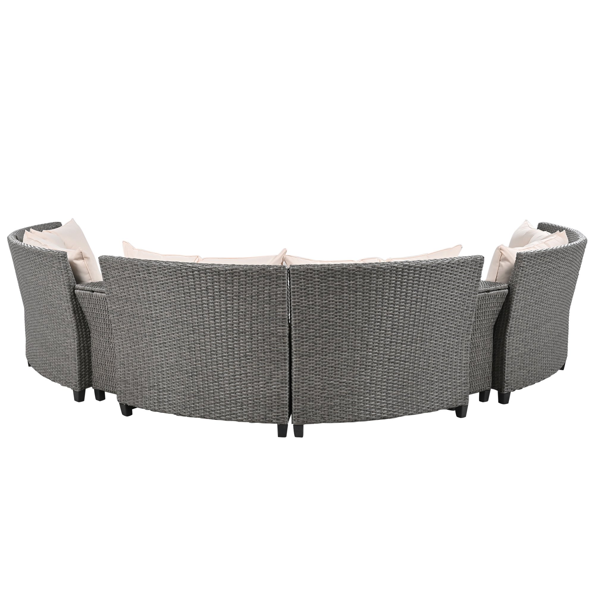 [VIDEO provided] 6 - Person Fan-shaped Rattan Suit Combination with Cushions and Table; Suitable for Garden