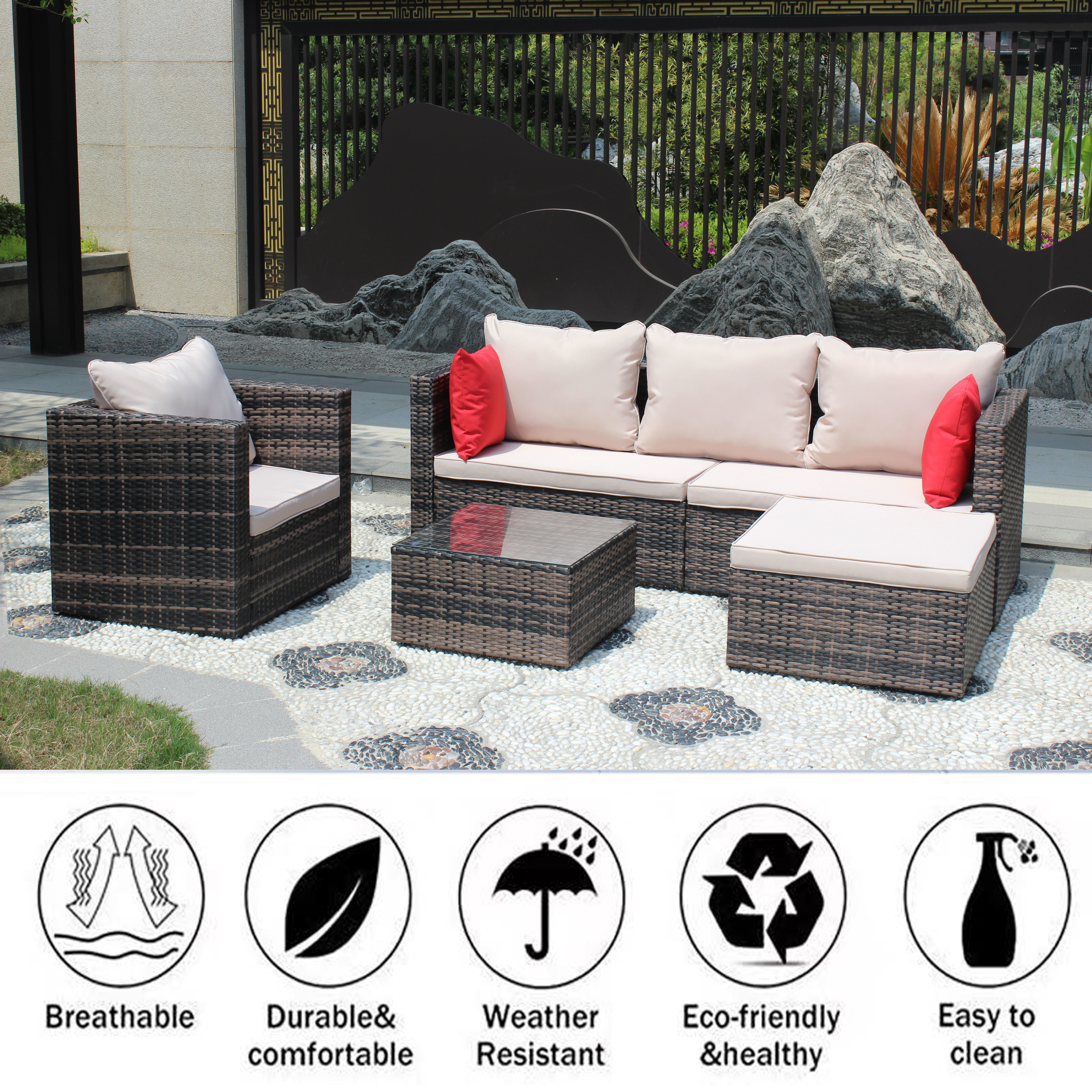 Prduct Dimension | 3-Seat dimension :24.4'' x 28.4'' x25.6 ''inch(L*W*H)Ottoman dimensions: 28'' x 28'' x 12.''inch(L*W*H)Armchair dimensions:31.5'' x 27.5'' x 25.6'' inch (L X W X H)Tea table :23.6'' x 23.6'' x 12 ''inch (L X W X H) | Detail Product Dimension | Please refer to the Size image | Tempered Glass | 0.2'' thickness | Manner of packing | 1 set/3ctn | Package Dimension and Weight | Package 1: 27.95*16.14*25.39inches, G.W: 33lbs Package 2: 38.18*13.77*27.55inches, G.W: 44lbs Package 3: 27.95*27.95*15.94inches, G.W: 40lbs | Weight Capacity | 3-seat: 700 lbs armchair: 350 lbsTea table :220 lbs ottoman:330 lbs | Pieces lncluded | 1*Single Sofa +1*3-seat sofa+1*Tea Table with clear tempered glass+4*Back cushions +4*Seat cushions | Bullet points | | Material | PE Rattan+Steel+Polyesglasster fabric+sponge+tempered | Removable cushion cower | Yes | Zipper for cushion | Yes | Color | Brown wicker, shallow brown cushion | Frame/Cushion Durability | Water Resistant /UV resistant | Assembly Required | Yes | Additional Tools Required | All Tools Included | Country of Origin | Made In China | Notice: