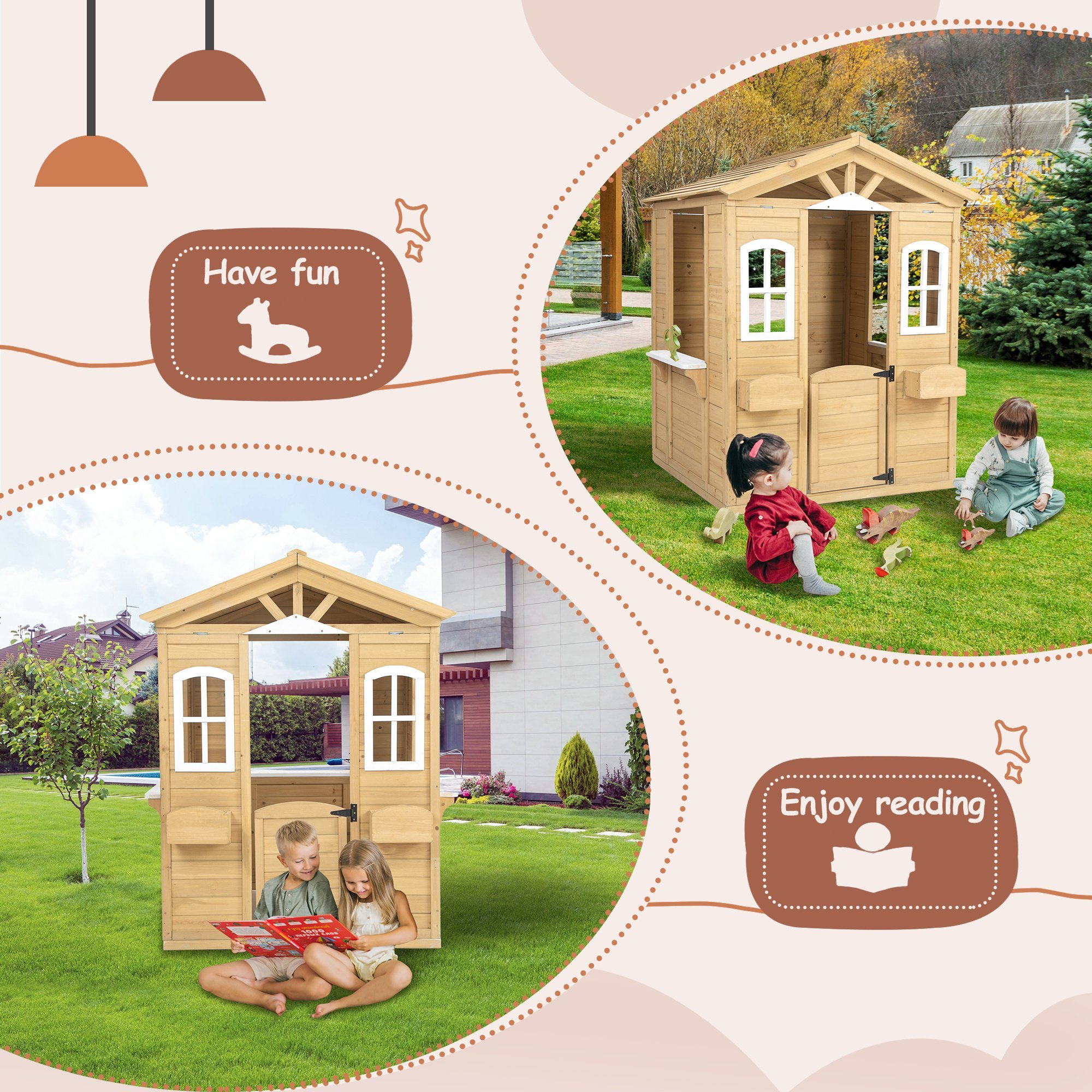 Outdoor Wooden Cottage : The playhouse is made with coated and natural fir wood for a structure that is solid and suitable for outdoor garden, lawn, patio, yard use. You can also paint different colors and show your children the different scenery in the four seasons. Easy to assembly.